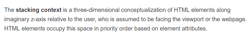 翻译过来就是: 层叠上下文是 HTML 元素的三维概念,这些 HTML 元素在一条假想的相对于面向(电脑屏幕的)视窗或者网页的用户的 z 轴上延伸,HTML 元素依据其自身属性按照优先级顺序占用层叠上下文的空间。