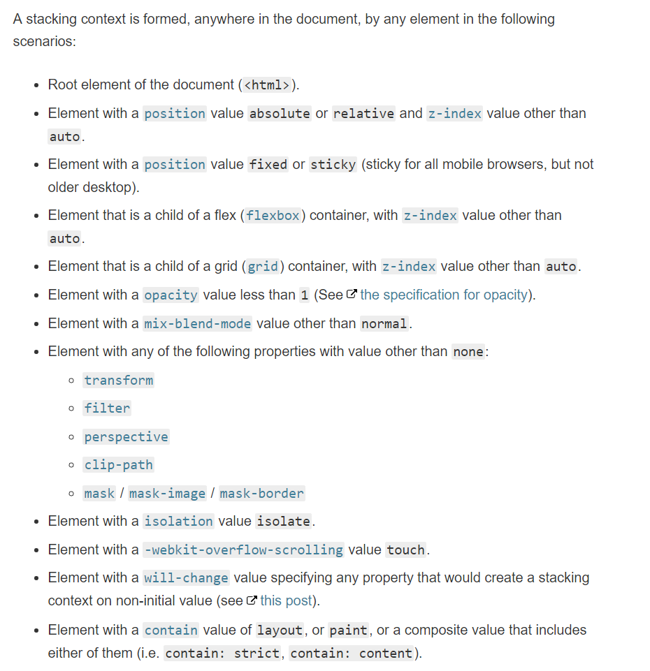 - 某些不需要设置 z-index 为数值就能生成堆叠上下文的元素(主要是 CSS3 新增的)