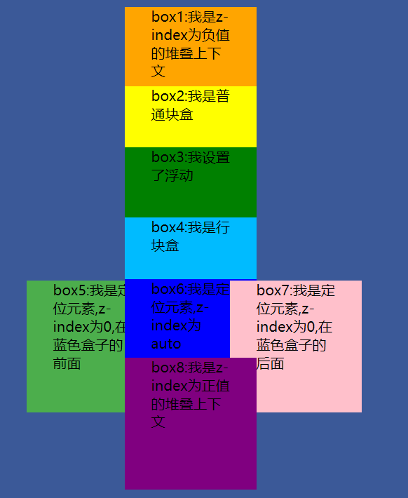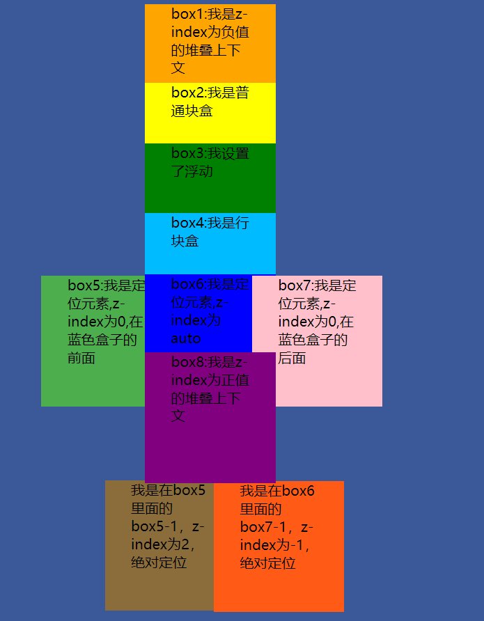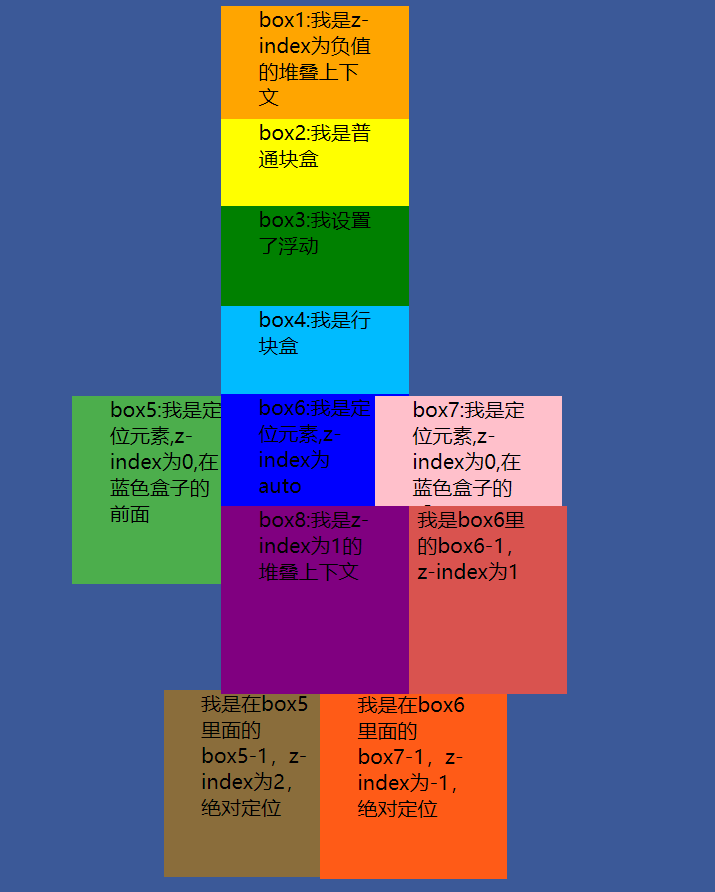 html 元素产生的堆叠上下文中有 8 个元素(box1 - box8),这 8 个 box 元素有他们对应的层叠等级(具体的等级参照上面),